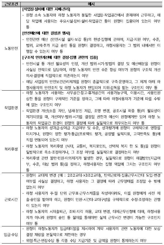 ‘원청의 사업에의 편입’ 및 ‘경제적 종속성’ 등의 요소는 근로조건에 대한 ‘구조적 통제’에 대한 보완적 지표로 볼 수 있습니다.